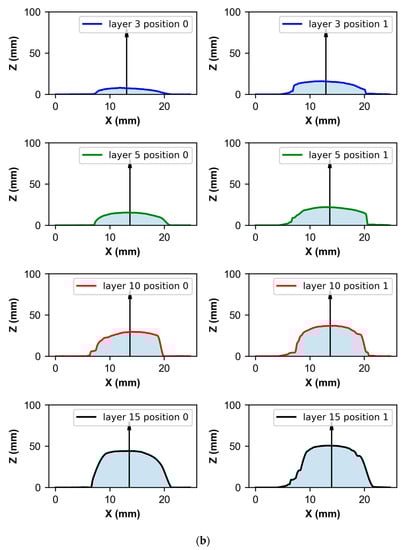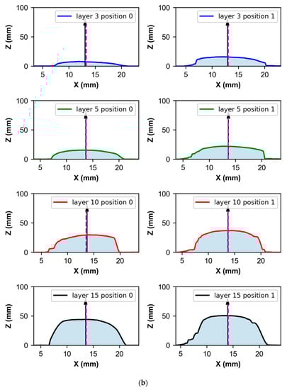 Figure 6a shows the value of the coefficient C as a function of the equation position xe around the centroid xi. C = 1 corresponds to pure symmetry and C = 0 when we have pure asymmetry. Figure 6a shows how the point of maximum symmetry is close to the centroid, which is consistent since the geometry of the deposited layer is intrinsically symmetric, as mentioned in several previous papers [29,30,31]. Figure 6b shows an example of four layers in two different positions; the arrow shows the centroid origin point and the dotted line (very close and easier to observe in Figure 6a) is the position of the point of maximum symmetry.