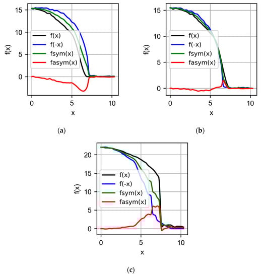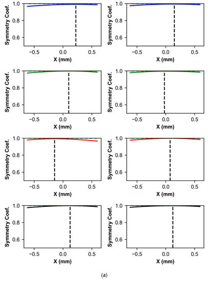 The symmetry and antisymmetry function were evaluated as described above in a section close to the centroid to obtain the point of maximum symmetry. It can be seen later, then, that due to the shape of the symmetry, this interval does not necessarily have to be large. In Figure 5a,c, we can see the symmetric and antisymmetric functions at the most extreme points of the analysis section. It can be seen that the greatest asymmetry occurs at the limits of the layer with the substrate. Figure 5b shows the value of x, where the greatest symmetry occurs between the two sides of the layer profile.
