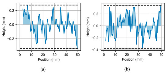 From Figure 10a,b, the waviness indicators in the middle section of the wall can be seen. Both the area closest to the substrate and the area of the last layers were discarded. Table 5 presents a summary of the main key corrugation indicators for both sides of the wall. The waviness values are similar on both sides of the face. It is also good that the arithmetic mean of the waviness is in the micron resolution with values close to 100 µm.