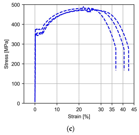 As can be seen in Figure 10a,b, the wall has typical layer-by-layer deposition waviness in the centre of the wall where the surface is analysed. The wall surface profile is provided in terms of waviness parameters because it is impractical to determine roughness values for this type of analysis. Note that both wall surfaces find an equilibrium between the maximum and minimum values, indicating that the wall is compensated. The stress–strain graph of the three specimens tested in the vertical direction of wall growth is shown in Figure 10c. The curve shows the typical phases of a mild steel curve with yielding, strain hardening, and final necking.