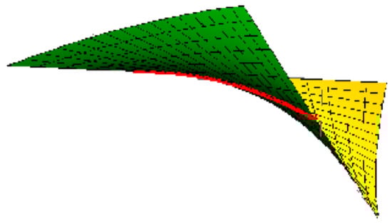 Here is a timelike unit speed spine curve, , s is the arc length parameter, and is the characteristic circle, with another parameter . It can be seen that is a timelike surface. From Equation (7) it follows that the expression of the two timelike developable surfaces is