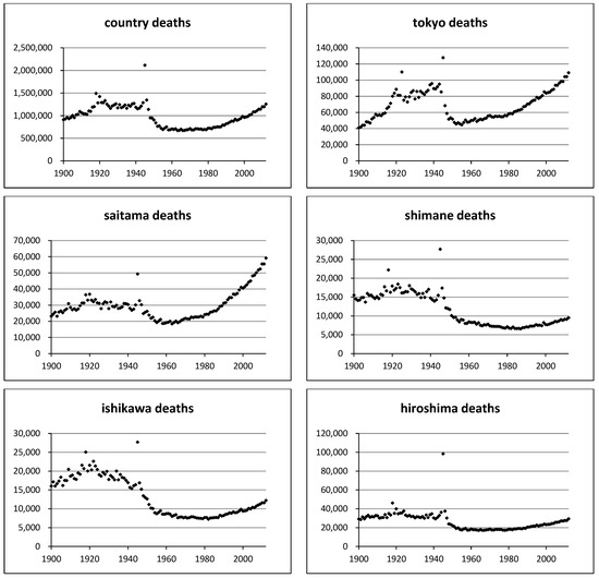 Among the four etiological factors, 1945 is the strongest, but the other three also had countrywide or local impacts. Figure 1 shows the deaths for the whole country: Tokyo, Saitama, Shimane, Ishikawa, and Hiroshima. These regions have differing characteristics, which will be discussed later in the paper.