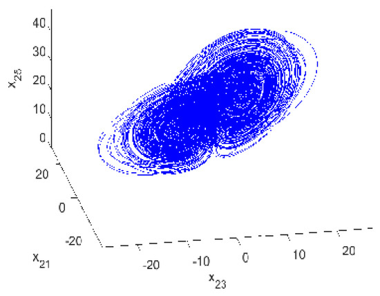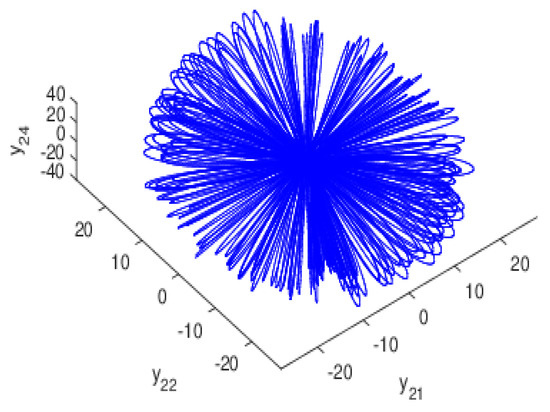 for the choice , , , , , for the model (29) and the initial values , model (29) has hyperchaotic solution, as shown in Figure 4 in space. Model (27) also has a hyperchaotic solution for the values of the parameters , , , , , and the initial values as depicted in Figure 5 for space.