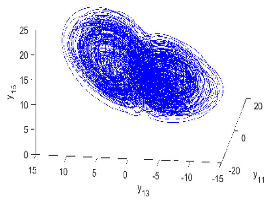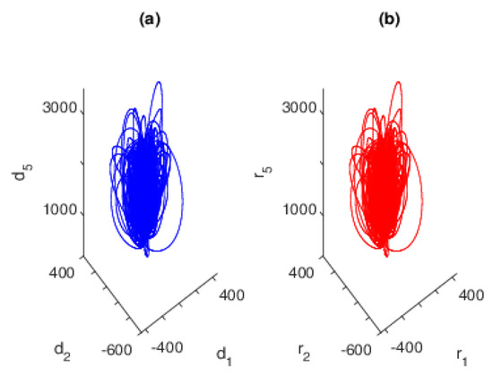 According to Theorem 1, the CCS between the three master models (26)–(28) and the two slave models (31) and (32) is hold. In the numerical results, we used the PECE (Predict–Evaluate–Correct–Evaluate) method [40]. The results of the CSS are described in Figure 6, Figure 7 and Figure 8. Figure 6 shows the same hyperchaotic solution for the three master models (26)–(28) in space and the two slave model (31) and (32) in space. The state variables between the three master models (26)–(28) and the two slave models (31) and (32) are depicted in Figure 7. Figure 8 gives the time slave of the synchronization errors; it is clear that CCS is achieved, as indicated by the convergence of the error state variables to zero.