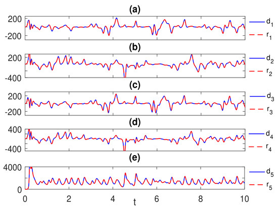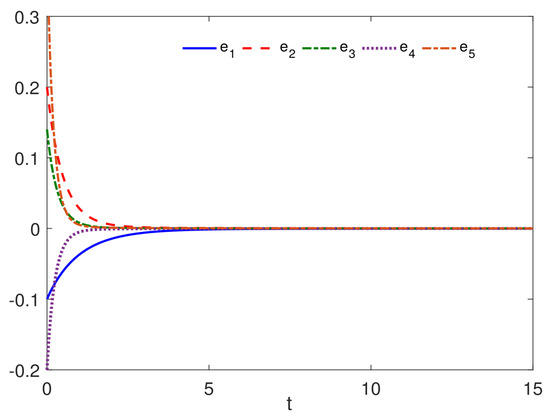 In this section, we tested and demonstrated the validity of the CCS for our example. Using Theorem 1 and the same values of the parameter values of the master models (26)–(28) and the slave models (29) and (30) which are used in Figure 1, Figure 2, Figure 3, Figure 4 and Figure 5, the gain matrix and the scaling matrices are chosen as =, where I is identity matrix, then the matrix takes the form: