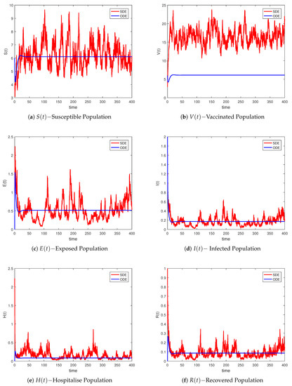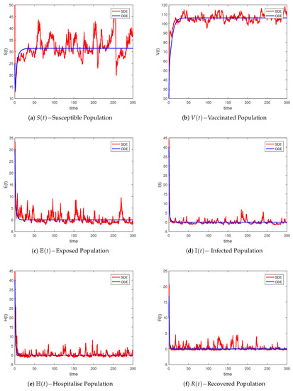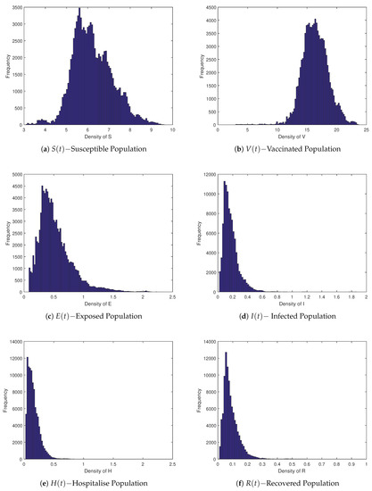 Next, we provide the digital findings for the stationary points of distributions. In Lemma 3, an ergodic condition is used to prove that the system is more realistic in the stochastic approach and has one stationary distribution. The stochastically given problem (2) is proposed for the parameter values given in Table 2 and evaluated as , so using Theorem 3, which is fulfilled, because of small intensities of white noises, the infection reflection will lie. We observe in Figure 2 that the infected system (2) will lie or remain in the mean, which may validate the output of Theorem 3 which implies that the system (2) lies on ergodic stationary distributions. The Susceptible, Vaccinated, Expose, Infected, and Recovered individual stationary distribution numerical simulations can be clearly seen in Figure 2a–f, respectively. Theorem 3 implies that model (2) must be ergodic stationary distributions. Figure 3 confirms this.