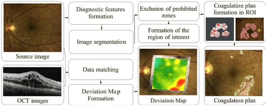 The methods of fundus image segmentation and coagulation placement described above represent the key steps for the formation of a coagulation plan since it is these steps that provide significant support in the manual formation of the coagulation plan. Among the presented stages (Figure 1), the first stage of data combination is a manual algorithm for placing key points. For doctors, the placement of key points is not difficult. The problem lies precisely in the manual arrangement of coagulates since in the manual mode this is a very laborious process. For the pathological zone to be isolated, information is needed on deviations of the retinal thickness from the norm. This information is provided by the medical SOCT software. The result produced by the software implementation is pre-processed, and a map of retinal deviations from the norm is formed. An excessive deviation is a sign of pathology in this area.