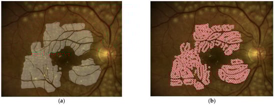 After that, the centers of coagulates are located in the obtained area. Then, the result of the placement of coagulates is consistent with the original image and superimposed on the fundus image (Figure 3b). To check condition (1) at some point, it is necessary to go around all the points belonging to the circle centered at the point under consideration.