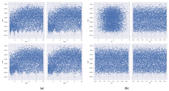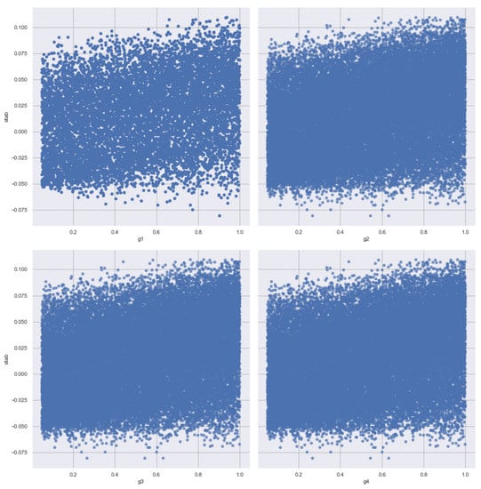 Figure 7 shows the partial scatter plots belonging to tau and p features of the aug dataset. Here, we can see the difference in p1 distribution more clearly, and also the relation of tau features has a more uniform distribution in the augmented dataset. Figure 8 shows the scatter plots of g features a reference to the “stab” response in particular. Here we can see a more uniform distribution of g.