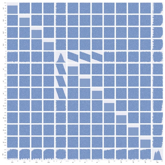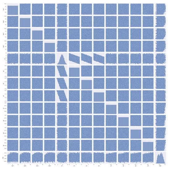 Figure 9 demonstrates the overall scatter matrix of the aug dataset with all the features and the “stab” response. In this matrix again, we can figure out the difference of the p–features’ distribution clearly. In the augmented dataset, again we can realize here the most correlated features by seeing the difference in scatters. Regarding the resolution and pixel values of the graphical presentations being very high, please feel free to zoom in to have a better vision of the visualizations.