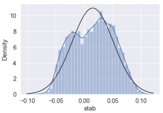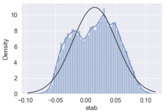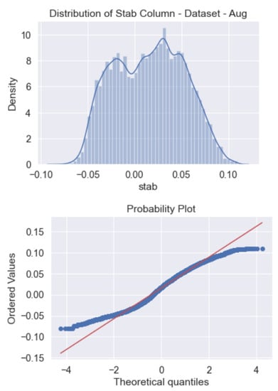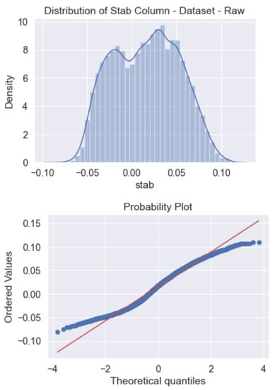 Figure 10 includes the probability plot and overall distribution of the “stab” response of the augmented dataset. We can see here again the response exhibits an almost linear distribution for the aug dataset. Additionally, in Figure 11, a distribution graph along with a normal distribution demonstration is also provided to clear out how close the “stab” response is to normal distribution. This time the response is closer to the normal distribution than the raw dataset. The excessive sample size of 60,000 may lead to this assumption. The gathered analysis reports from the data analytics and feature engineering might open a door to a better understanding of the feature importance analysis, which will be held in the next sections.