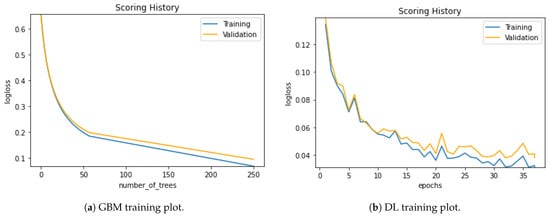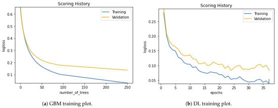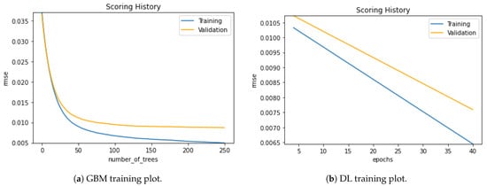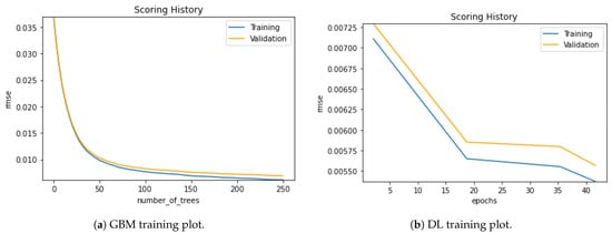 Figure 15 shows the training plot of the raw dataset with GBM and DL models for the regression approach. Together with the training process, we can follow the validation curves. In both models, we can see a clear training process with fewer validation and training loss errors.