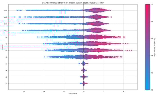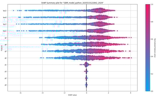 SHapley Additive exPlanations (SHAP) summary graphics visualize the contribution of the features for each row of the dataset. The main purpose of SHAP is to describe the prediction of a sample of the dataset by computing the contribution for each feature to values of the prediction [30]. The SHAP plot can further state the positive or negative relationships of the features with the response variables. Figure 19 and Figure 20 show the SHAP plots of the proposed GBM model for the raw and augmented datasets, respectively. Here, our SHAP plots tell that the p–features contribute to the response less than other features. Apparently, there would be conducted any additional analyses with dropping the p–features from both datasets. These assumptions clearly sensed from the correlation matrices and variable importance plots, too. The dominance behavior of the g and tau features are clearly seen with the SHAP plots.