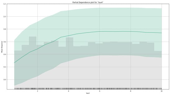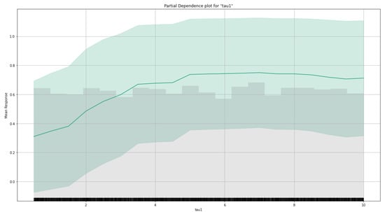 Figure 21 and Figure 22 demonstrate the partial dependence graphs of the proposed GBM model for the raw and the aug datasets, respectively. These plots are presented only for the tau4 in the raw dataset and tau1 in the augmented dataset. Because these features are at the top of the variable importance list for the raw and aug datasets. A partial dependence plot (PDP) shows a graphical visualization of the marginal effect of a feature on the response. The effect of a feature can be measured in variation in the mean values of the responses. PDP states the independence between the feature for the one it is the PDP calculated and the remains [30].