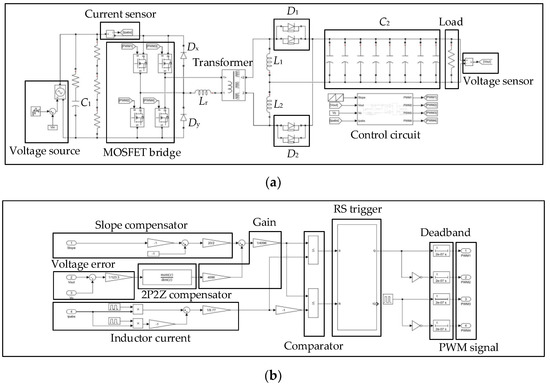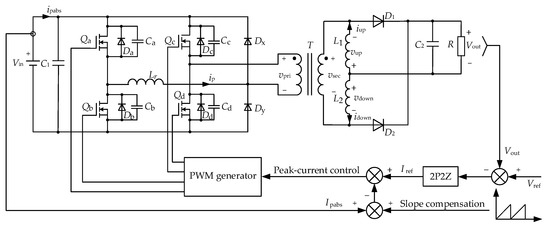 Figure 3 shows the topology and the control strategy of the converter, while the value of key components is listed in Table 2. The primary side of the converter is a phase shift full bridge, where the MOSFET gate drive signals on the same bridge arm are complementary, and the duty ratio is 50%. There is a phase-shift angle between the gate drive signals of the MOSFET on different bridge arms, and the output voltage can be controlled by adjusting the phase-shift angle. Due to its simple and controllable dynamic characteristics, as well as high precision output voltage control, peak-current control is selected to generate the pulse width modulation (PWM) waveform for driving the MOSFETs. A digital signal processing (DSP) chip is applied to implement the control strategy, where the digital compensator is realized by the control code, and a 2-pole 2-zero (2P2Z) compensator is chosen. the voltage of sampling and reference voltage to the compensator are input, allowing the reference value of the peak current to be generated through calculation, in order to realize the peak-current control. The PWM waveforms of the phase-shift control are shown in Figure 4.