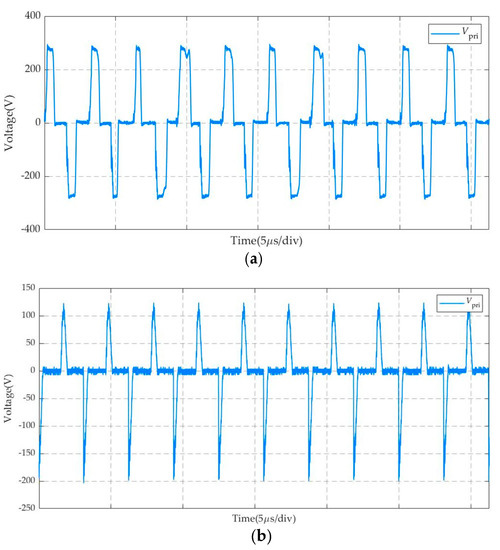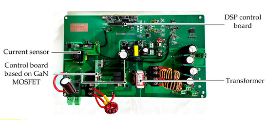 As a third generation semiconductor material, GaN is of a wide bandgap, with a high thermal conductivity, and has good chemical stability, thereby having the characteristics of high operating temperature, high breakdown voltage, as well as strong anti-radiation ability [27]. Thus, GaN MOSFET is chosen as the switch on the primary side of the converter. The hardware experimental platform is shown in Figure 5.