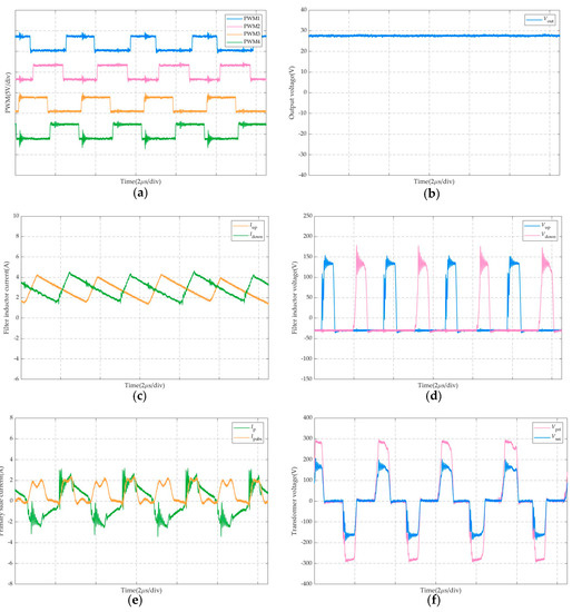 Voltage and current waveforms collected from the physical layer. (a) PWM waveforms; (b) Output voltage waveform; (c) Secondary side current waveforms; (d) Secondary side voltage waveforms; (e) Primary side current waveforms; (f) Transformer voltage waveforms.