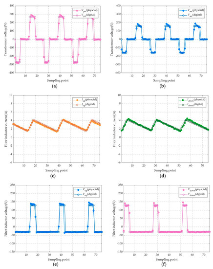 Comparison of steady-state waveforms between physical layer and digital layer. (a) Primary side voltage of transformer; (b) Secondary side voltage of transformer; (c) Current across L1; (d) Current across L2; (e) Voltage of L1; (f) Voltage of L2.