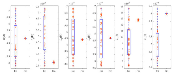 Figure 11 shows the distribution of the parameters of the main components at the beginning and the end of the iteration, by boxplot. The value of load resistance usually remains unknown, in order to deduce its actual value. R is also included in the experiment.