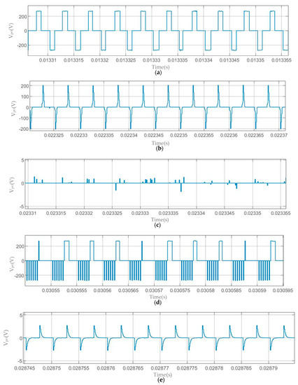 Vpri waveforms of digital twin under different running conditions. (a) Normal; (b) Leading arm open-circuit; (c) Lagging arm open-circuit; (d) Load open-circuit; (e) Resonance inductor open-circuit.