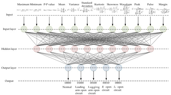A BP ANN is established to classify different running conditions of the converter. BP ANN is a multilayer feedforward network trained by error back propagation, it learns certain rules through training and gets the result closest to the expected output when given the input. BP ANN has the ability of complex pattern classification as well as excellent multi-dimensional function mapping. The established BP ANN has three layers, including one input layer, one output layer and one hidden layer with 10 neurons. The logsig function is selected as the transfer function of the hidden layer, the purelin function is selected as the transfer function of the output layer, while the traingdx function is selected as the function of backpropagation. The structure of the BP ANN is shown in Figure 14.