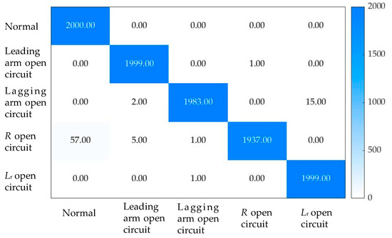 It can be seen from the Figure 15 that the diagonal squares are very dark in colour, which means the BP ANN can classify different running states with high accuracy. There are a few very light blue squares, which means only a small number of data in the test set is mis-classified. Thus, the BP ANN can identify different running states of the DC-DC converter within one single period.
