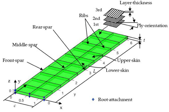 The partial topology of a composite aircraft wing with fuzzy uncertainties in material property and allowable transverse displacement on the wing is used as a design demonstration. Unconventional aircraft wing structures can be synthesized using the traditional Goland wing model [30], which is demonstrated in Figure 3a. The traditional Goland wing geometry has chord length (c), semi-span wing (L), and wing thickness (t) of 1.216 m, 6.096 m, and ±0.0508 m, respectively. The unconventional aircraft wing structure is made of aluminum ribs and spars, as presented in Figure 3b. The unconventional structure optimization can be performed with the MRBPTOFMH technique. The skin thicknesses (3 layers) and ply orientation of the laminated carbon fiber are the design variables. The properties of both materials are presented in Table 1. The objective functions are structural mass and flutter speed. The first objective function is aimed to save energy for the modern aircraft, while the second objective function is to protect the aircraft from wing failure caused by unstable speed. The constraints include lift effectiveness and transverse deflection, which are assigned as a constraint function to handle the aircraft structural performance. The optimization problem is expressed as: