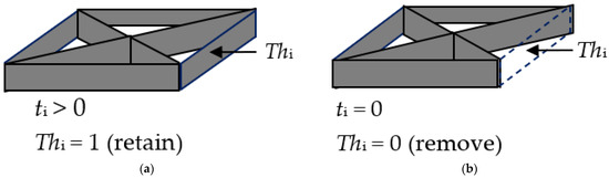 The partial topology and sizing optimization procedure for the present work is subjected to the ground structure approach [12,13]. Typically, the process is divided into two steps. Firstly, it is started with defining the discrete domain, which is formed by truss, frame, and panels as shown in Figure 2a. Lastly, optimization is performed with the decision to retain/or remove each element from the design domain. The design variables are the width/thickness of each element. If the element thickness is close to zero, the element was removed, as illustrated in Figure 2b, otherwise, the element was retained. With this concept, partial topology and sizing can be performed simultaneously. The decision to remove or retain can be represented as:
