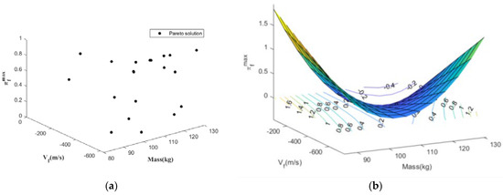 (a) Pareto frontier of the composite wing and (b) Response surface of the Pareto solution set and its contour plot.