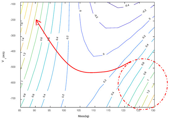 The optimum Pareto reliability-based solution set is presented in Figure 5a, while its response surface graph with surface plot and contour plot are illustrated in Figure 5b. Some selected optimum solutions are shown in Table 2 and Figure 6. The result of the deterministic solution is represented with PSI πfmax = 1. The results of some selected allowable PSIs of the composite aircraft wing design are shown as the remaining data in the same Table using a clustering technique [12]. From Table 2, it can be seen that the aeroelastic results and structural constraints can be designed to meet the proposed constraints in (10). The PSIs vary from 0.001 to 1. The contour plot (Figure 7) shows that the allowable PSIs increase with the decrease in the total mass of the aircraft structure, as illustrated with a red arrow, but a contrary case is observed at the corner zone of the Figure (depicted with a dotted circle line). The graph shows that the reliability-based design group (πfmax < 1) obtains a higher mass when compared with the group with the deterministic design. This means the group with lower allowable PSIs generates more safe structures. Another observation from the data (Figure 7) is that the PSI values for flutter speed are not in the phase of mass. This means that it is not always true that the group with the highest mass is better equipped to endure the unstable speed (flutter speed) than the group with lower mass. According to previous studies, flutter speed is not affected by mass [57], but it is affected by ply orientation. In addition, the present findings are in accordance with our earlier research [47], which demonstrated the relationship between PSI values and reliability values (R). The decreasing πfmax and higher R indicate a safer structure. The present study establishes the relationship between these two. Table 3 presents a few chosen design elements from the results listed in Table 2. This Table focuses on the effect of the composite skin of the aircraft wing on flutter speed. The outcomes illustrate that all configuration layups are anti-symmetric layups. The cross-ply orientations at 45° (grey highlight) are obtained in a group with the reliability design, while the deterministic design obtains orientations at 60° (green highlight) and 90° (yellow highlight). In some cases, a group of deterministic designs randomly obtains orientations at 45°, 60°, and 90°. These outcomes are in accordance with the previous study [47]. Related to the work [57], can be concluded that the less reliable layups are those with 60° and 90°, while layups with 30° and 45° have high reliability. In agreement with the results in Figure 6, the minimum variation in flutter speed occurs in the case with the highest reliability, which is the layup with 45°. In general, the 90° cross-ply orientations obtain medium bending and torsional strength, while the 45° cross-ply orientations obtain flexible and high torsional strength. Previous knowledge is in accordance with the results that the more reliable obtain higher transverse displacement than the less reliable. Figure 8 and Figure 9 show a few of the chosen aircraft wing structures from Figure 6 with varying πfmax values that lead to varied aircraft geometries; the lower the πfmax, the safer the structure. Table 3 and Figure 9 illustrate that some of the skin thicknesses of the high-reliability group realize an approach to their upper limits (dark grey highlight) in comparison to the deterministic design.