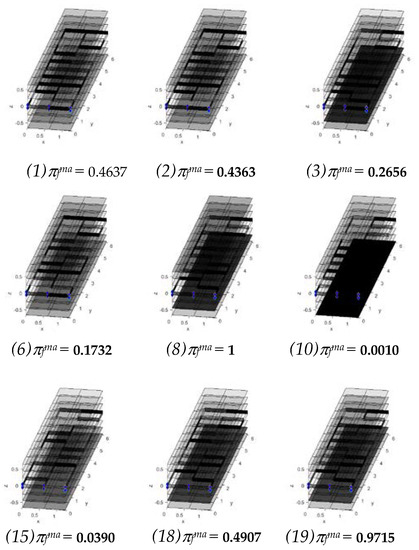 In the design, a partial topology and sizing optimization of the composite aircraft wing structure is considered along with uncertainties in the material property and allowable transverse displacement. The material property is Young’s modulus, and the allowable transverse displacement is ual. Fuzzy uncertainty, called normal membership functions, is used to model the uncertainties where and . The core function of Young’s modulus is Em = 70 GPa, while the allowable transverse displacement is . With the proposed MRBPTOFMH technique, Equation (10) can be changed to Equation (8). In this experiment, the problem is solved with a personal computer: AMD Ryzen 5,4600 H with Radeon Graphics 3.00 GHz, 8.00 GB, 64-bit Window 10 operating system. The optimizer setting in this research considered a population size of 68 and 100 total iterations, while the Pareto archive size was 20. With the new technique, the PSI values are in the range of 0.001–1.
