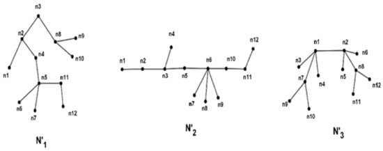 From Lemma 1, we deduce that cannot be the greatest. Since , we get . Assuming the , this implies that the order of tree is equal to 5 or 6. When , we get only two trees with given by and . When the order is then we get only trees and , and the result is verified because and do not have the greatest values of (by Lemma 1). As a result, we only consider the situation when and . Suppose N to be a tree with an order , with and an independence number . Let be the path in with the greatest length, where denotes the diameter of (see Figure 2).We can assume that d ≥ 3 or else , , and the result is true. Both and are end vertices.