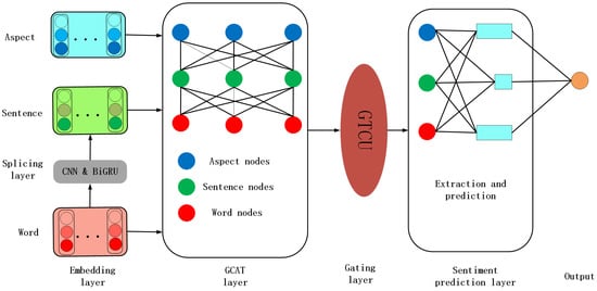 To alleviate the above challenges, we propose a new aspect-level sentiment analysis model, GCAT-GTCU. First construct sentence nodes, word nodes, and aspect nodes, splice CNN and BiGRU to extract deep local and deep features of sentences; then, add node connection information to GAT to form GCAT containing symmetry, update the three nodes and realize information interaction to make semantic information flow in the three nodes; then, introduce a new gating mechanism GTCU to control the path of sentiment flow to the pooling layer; and finally outputting sentiment classification by extracting information from the three nodes.