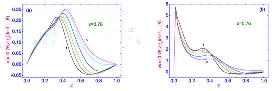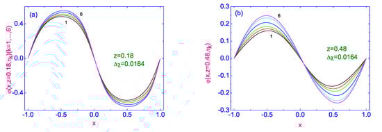 Plots of the polar angle to its stationary distribution along the width of the HAN microvolume, for two values of dimensionless distance (Figure 1a) and (Figure 1b), calculated from the orientation defect on the lower surface, where the director’s orientation is characterized by sharp changing along the lower bounding surface, from one tilted () to another tilted () orientation, are shown in Figure 1a,b, respectively.