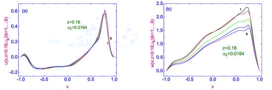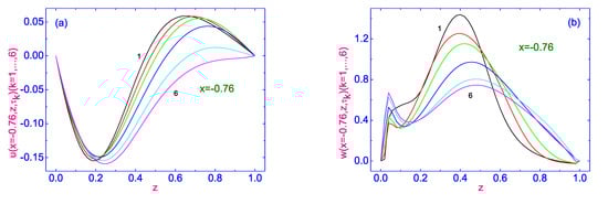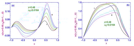 Evolution of both the horizontal (a) and vertical (b) components of the velocity field to their stationary distributions and across the HAN microvolume, near the left vertical bounding surface , respectively. Here 6 curves for u and w are plotted as solid lines and correspond to the time .