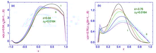 The evolution of horizontal (see Figure 4a) component of the velocity field to its stationary distribution along the width of the LC drop, calculated far () from the orientational defect is characterized by a multidirectional flow. Indeed, near the left () and right () vertical bounding surfaces, the flow is directed in a positive sense, while in the central region () it is directed in a negative sense. Moreover, near the right vertical boundary, the value of the horizontal component of the velocity field ∼∼m/s) is about three times greater than the value of this velocity in the domain with the flow ∼∼m/s) directed in the negative sense. At the same time, the evolution of the vertical component of velocity field to its stationary distribution, along the width of the LC drop calculated far () from the orientational defect is characterized by the flow in the positive sense, and the greatest value of is ∼∼m/s).