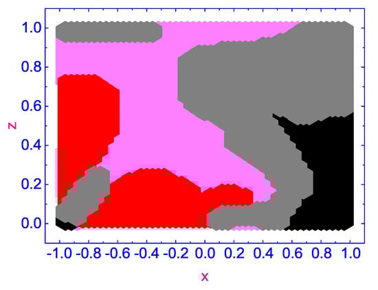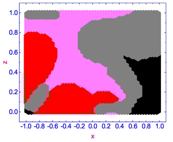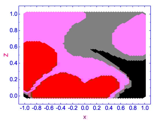 According to our calculations, a number of complex vortex domains rotating in opposite directions are excited in the HAN microvolume under the effect of the temperature gradient : two domains with the vortex flow excited in the negative sense around their centers with (rotating anti-clockwise) (pink colored domains), one domain with the vortex flow excited in the positive sense around its center with (rotating clockwise) (gray colored domain), and two domains, both with a small (slowly rotating clockwise) (red colored domain) and (slowly rotating anti-clockwise) (black colored domain), respectively. Over time ∼ (see Figure 8), the complex pattern of forming vortices in the microscopic HAN volume changes, and domains with small values of are displaced to the boundaries of the HAN cell, while three domains with (rotating clockwise) (gray colored domains) and one with (rotating anti-clockwise) (pink colored domain) are moved to the central part of the HAN volume. As the HAN microvolume warms up further, up to ∼ (see Figure 9), the picture of the distribution of rotating domains is finally formed. Three domains with (rotating clockwise) (gray-colored domains) are formed near the upper and lower corners and to the right of the center of the HAN microvolume, while one domain with (rotating anti-clockwise) (pink-colored domain) is placed to the left of the center of the HAN cell. At the same time, two domains with small values of (slowly rotating clockwise) (red-colored domain) and (slowly rotating anti-clockwise) (black-colored domain), where rotation is almost negligible, are shifted closer to the boundaries of the HAN cell.