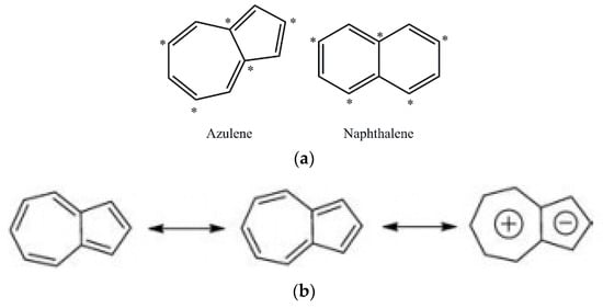 The structure of azulene, a bicyclic nonalternant aromatic hydrocarbon (Figure 1a), consists of an electron-deficient seven-membered ring (tropylium cation) fused with an electron rich five-membered ring (cyclopentadienyl anion). Its polarity is reflected by the presence of a relatively large dipole moment (1.08 D) (Figure 1b). Even though both skeleton isomers, azulene and naphthalene, have the same composition (C8H10) and degree of unsaturation (five double bonds and two fused rings), azulene has distinct absorption bands and electronic transitions compared to its naphthalene isomer (Figure 2a). By varying the nature of the electronic substituents grafted on the azulene moiety in the positions where the electron density is the highest, the wavelength of the light absorbed can be finely tuned [8] and significant changes of the optical and photophysical properties have been observed [9,10,11].