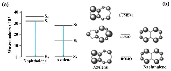 (a) Unique fluorescence observed for naphthalene and azulene. (b) Probability of locating the electron (squares of coefficients of each wave−function) in the HOMO, LUMO, and LUMO+1 of azulene (left) and naphthalene (right).