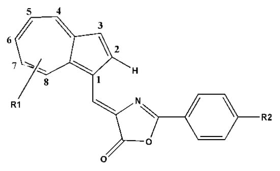 Chemical structure of investigated azulenyl-vinyl-oxazolones: R1 = H; 4,6,8-Me3; 5-iPr-3,8-Me2; R2 = H; NO2.
