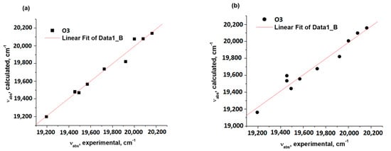 Linear relationship between experimental and calculated absorption maxima for (a) O3 using Equation (6) and (b) O3 using Equation (7).