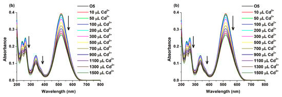 Changes in the UV–Vis absorption spectra in acetonitrile solution upon the addition of increasing amounts of Cd2+ (a) for O2 and (b) for O5.