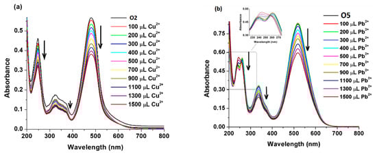 Changes in the UV–Vis absorption spectra in acetonitrile solution upon the addition of increasing amounts of (a) Cu2+ for O2 and (b) Pb2+ for O5. The inset shows the enlarged view of the 220–270 nm range.