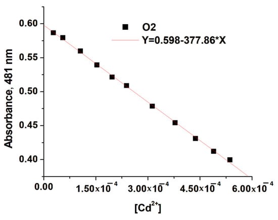 Given the outstanding binding characteristics of azulene compounds with metal ions, they can be used for heavy metal ion detection [39,40]. The metal ion recognition behavior of the azulene derivatives was evaluated upon their titration by successive increments of metal ion, and the changes in the electronic absorption spectra were monitored. The evolution of the UV–Vis spectra of O2 and O5 derivatives with the four metal ions at different concentrations is depicted in Figure 6, Figure 7, Figures S6 and S7. The addition of each cation caused the progressive decrease in intensity of the absorption bands of azulene derivatives (Figure 6, Figure 7, Figures S6 and S7), with the exception of the absorption band in the 250–270 nm range where, during titration, an increase in absorbance was noticed due to the absorption of metal salts [41] (Figure 7b inset). A good linear relationship (R2 = 0.99) was obtained for the plot of absorbance of the longer wavelength band versus the metal ion concentration for O2 during titration with Cd2+ ions over the range of 2.71 × 10−5 to 5.35 × 10−4 M Cd2+ content (Figure 8). The decrease in intensity of the absorption band at longer wavelengths with adding increasing contents of metal ions was seen to be 35.5% for Pb2+, 32.6% for Cu2+, 30.4% for Cd2+ and 32.7% for Hg2+, taking into account the ratio Af/Ao, where Ao is the absorbance before the addition of metal ion and Af is the absorbance corresponding to the constant value after the addition of metal ion.