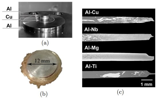 Recently, a new approach has been developed—a solid-phase connection of thin discs of Al and other metals by means of shear deformation on Brigman anvils [13,14,15,16,17,18]. The interafce region between two metals can be the special place of the formation of the intermetallic phases owing to diffusion, which is a result of such deformation treatment. The other effective way to facilitate diffusion is annealing [14,15,19,20,21]. To date, several different systems were studied under high-pressure torsion (HPT): Al/Cu [13,16,22,23], Al/Nb [14], Al/Mg [24,25] and Al/Ti [26,27,28]. In Figure 1, the example of the experiment conducted in [17] is presented: (a,b) set of discs before and after HPT and (c) the backscattered electron image of the composites in the as-processed state: Al-Cu, Al-Nb, Al-Mg, and Al-Ti are presented. The dark areas correspond to the Al-rich phase in Al-Cu, Al-Nb, and Al-Ti composites, while in Al-Mg composite Al-rich phase corresponds to the bright areas. However, the degree of mixing is different in different composites. Thus, the study of the mechanism of interface recombination is of key importance for the understanding of the mechanisms of phase formation during HPT and other fabrication techniques, for example, steer welding [29,30,31]. In experiments, the appearance of aluminum oxides is often observed, which can worsen or improve diffusion and affect the properties of composites [32,33,34].