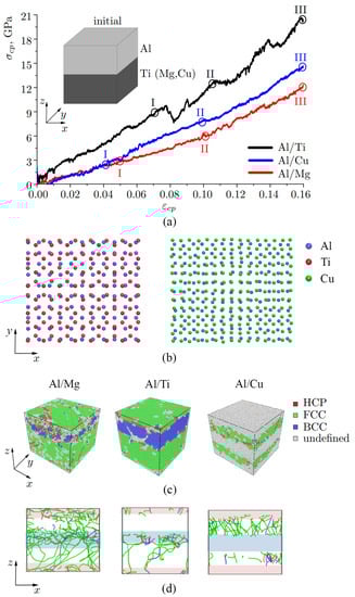 Figure 2a shows the stress–strain curves after compression along with the schematic of the initial structure and the snapshots of the three different composites Al/Me obtained after compression (point III, = 0.16). Snapshots of the interface region are shown in Figure 2c: two layers of Al (blue atoms) and two layers of Cu (green atoms) or Ti (red atoms). Only part of the interface is shown to check the symmetry of the interface. The initial structure is obtained in such a way as to make three different bi-metallic samples of the same size and to satisfy the periodic repetition of the simulation cell. From this point of view, the symmetry or coherency of the interface is not considered. For FCC metal (100) plane is chosen, while for HCP metal (0001) plane is chosen. As can be seen, two (100) FCC planes are not the best combination, since atoms from the lower interface are repelled by atoms from the upper interface and the symmetry of the crystal lattice is broken. For FCC/HPC interface we also have quite low symmetry. This will further lead to the dislocation nucleation near the interface region.