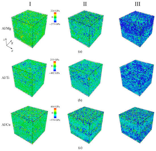 Distribution of the stress on each atom () for three deformation stages (points I, II, III from Figure 2a). Three bimetallic systems are presented: (a) Al/Mg, (b) Al/Ti, (c) Al/Cu. Atoms are colored in accordance with the color bar for each system.