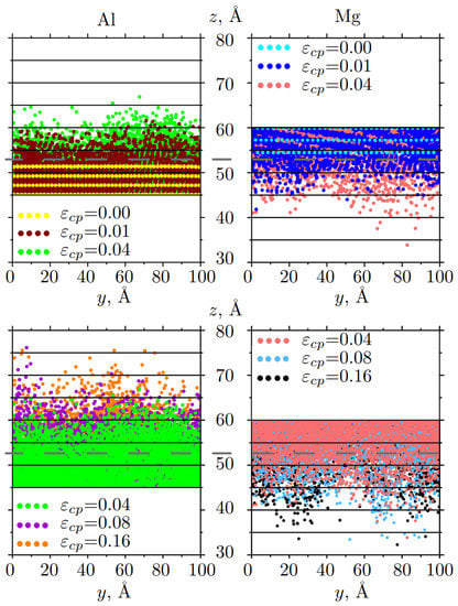 After compression to = 0.16, mostly the BCC phase can be seen in the Mg part of the composite, while the interface area, where Al and Mg atoms are mixed, is defined as FCC lattice. Most dislocations nucleated near the interface between Al and Mg (shown by shaded zones). In the elastic regime ( 0.045), reverse phase transformation took place from BCC to HCP phase. An FCC atom layer also can be seen from CNA which corresponds to the presence of the stacking faults and twins in Mg. As it was shown, twinning is one of the effective mechanisms of deformation in Mg [75,76].