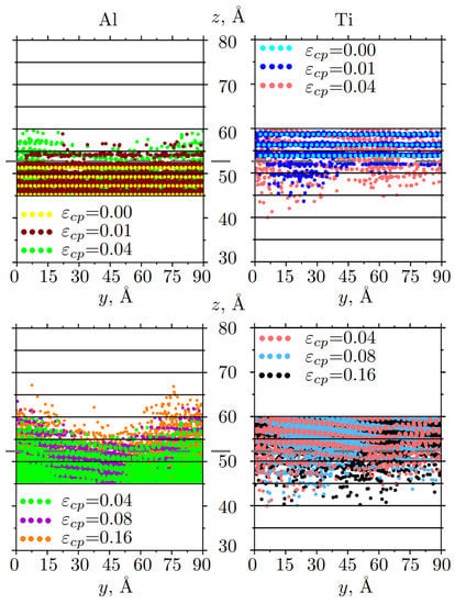 As can be seen, Ti atoms move faster in the central part of the sample (Figure 5 (up), right side, blue and light red dots), while Al atoms move faster at the edges (Figure 5 (up), left side, brown and green dots). During compression up to the strain =0.04, Ti atoms penetrate more actively near the mixing interface than aluminum atoms and pass into the Al part for about 14 Å. After = 0.04, Ti atoms practically do not change their positions, while Al atoms continue to slowly move inside Ti part. However, at = 0.16, the number of Al atoms diffusing into the Ti block is almost the same as the number of Ti atoms moving into the Al block. During compression, the greater number of atoms are involved in the diffusion process, and the width of the diffusion zone increased with strain increase.