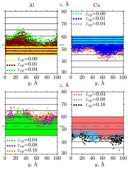 After compression to = 0.16, most of the dislocations appeared in the Cu part of the composite (Figure 2d). For Al/Cu (Figure 11), only two strain values are shown, since no special changes in the structure are observed. For this case, OVITO could not determine the type of crystal lattice in the interface as well as dislocation distribution.